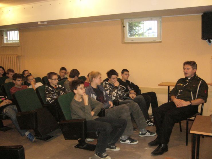 nauczycielka historii wraz z młodzieżą. Gościliśmy także w tym dniu delegację harcerzy z Wilna. Harcerze pod opieką księdza druha Dariusza Stańczyka przebywali w Pabianicach na zaproszenie Wiceprezydenta Miasta Pana Dariusza Wypycha. W spotkaniu uczestniczyło 8 klas wraz z nauczycielami. Goście mówili o różnicach w pojmowaniu patriotyzmu, niepodległości i wolności wśród Polaków w Polsce i mniejszości polskiej na Litwie. Wystąpienie zawierało szereg pieśni patriotycznych, wierszy oraz pokaz zdjęć z odbywających się na Litwie a organizowanych przez harcerzy "Sztafet Niepodległości". |