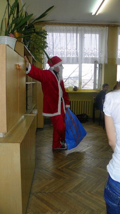 szkolne mikołajki. Św. Mikołaj wraz ze śnieżynkami obdarowali wszystkich słodyczami. Uczniowie przebrani w mikołajkowe czapeczki nie byli w tym dniu pytani. Dodatkowo została zorganizowana mikołajkowa loteria fantowa. Za parę groszy można było wylosować naprawdę fajne prezenty. Loteria cieszyła się ogromnym zainteresowaniem wśród uczniów, nauczycieli, a także innych pracowników szkoły, losy rozeszły się niemal błyskawicznie. Szkoda, że następne mikołajki dopiero za rok. |