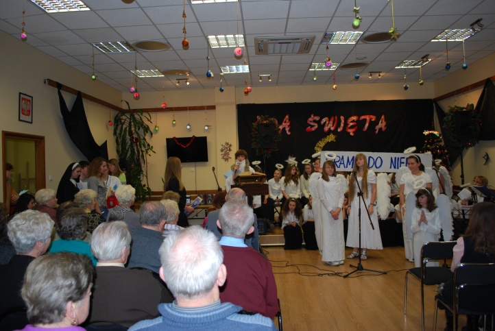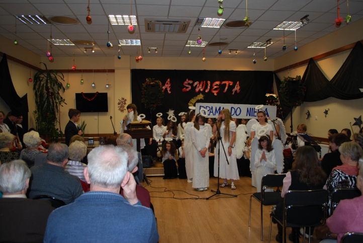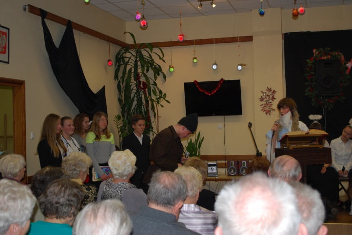w „Baraku” dla wszystkich członków klubu seniora „Jarzębina”. Przewodnicząca klubu p. H. Mamrot serdecznie nas powitała i zaprosiła wszystkich do wysłuchania programu. Po koncercie serdecznie podziękowała występującej młodzieży i w podziękowaniu przekazała słodki poczęstunek. Jednak najmilszym podziękowaniem były gorące oklaski i pełna sala gości. Przedstawienie przygotowali uczniowie pod kierunkiem p. Agnieszki Krzysztofik, p. Marka Słowika, p. Wioletty Sobieraj i p. Beaty Debich. |